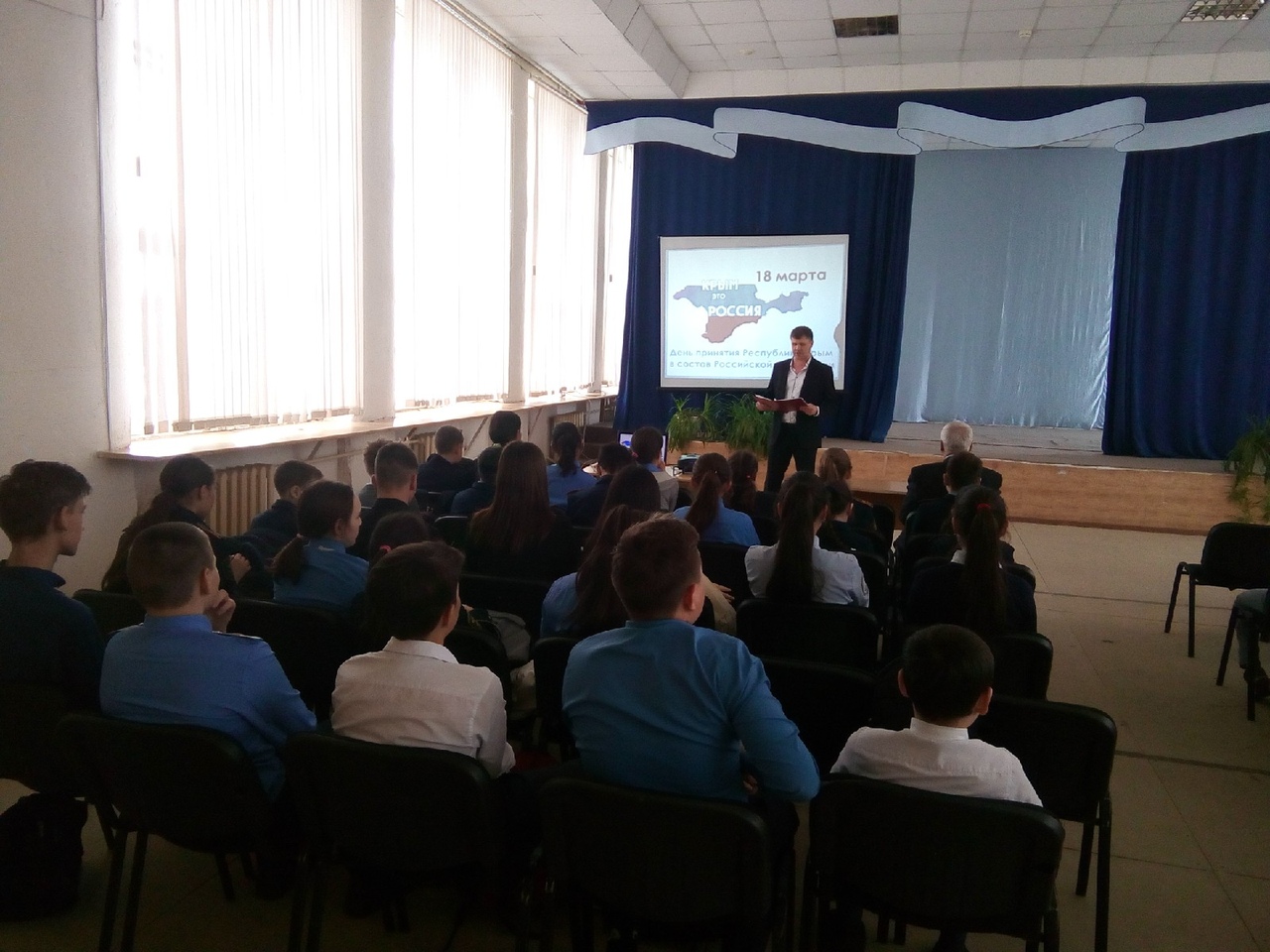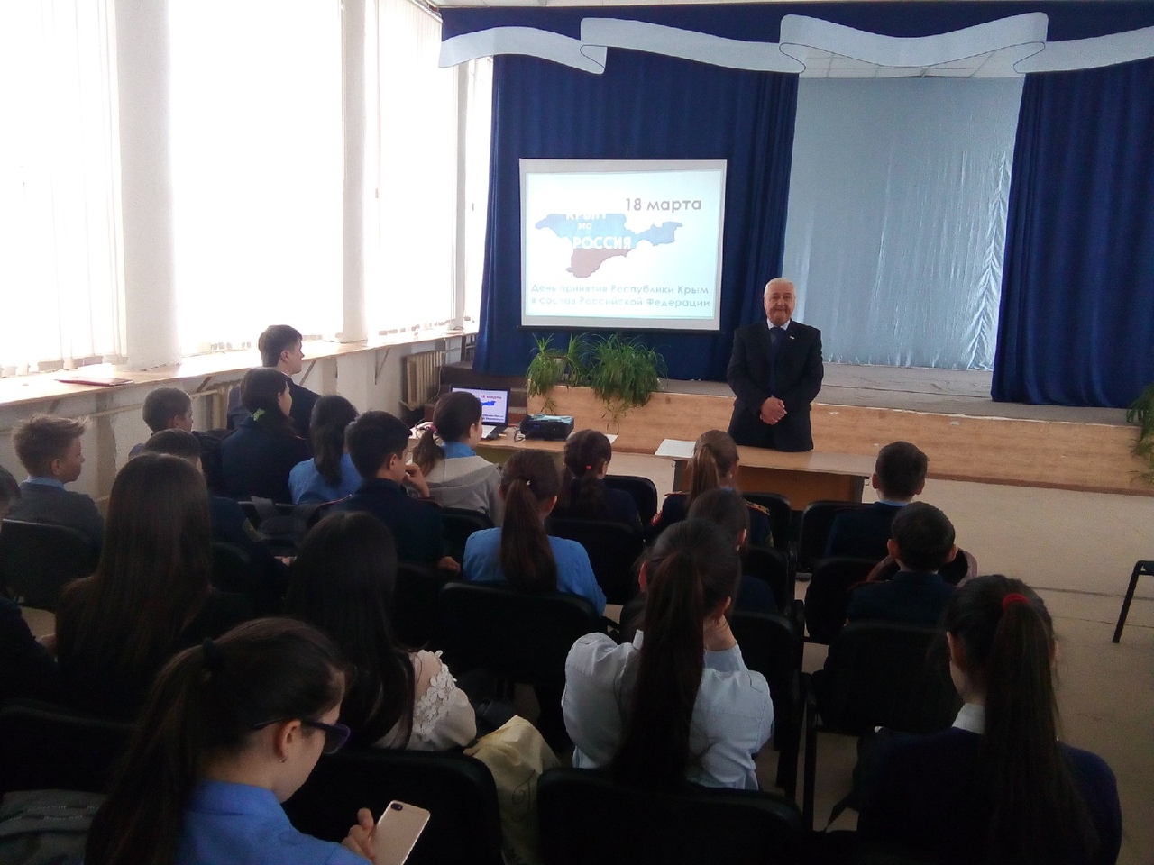19.03.2019 в рамках движения "Сделаем вместе" и 5-летней годовщиной Воссоединения Крыма и Севастополя с Россией, МОБУ СОШ №7 приняла участие во Всероссийской Акции "Русский Крым и Севастополь". Учитель истории Дмитрий Юрьевич Антипин, преподаватель - организатор ОБЖ Фаяз Мажитович Хасанов и депутат Совета ГО г. Сибай Марат Анварович Мухаметов провели урок для учащихся 6-10 классов. Познакомили ребят с многовековой историей полуострова, рассказали о впечатлениях поездки в Крым, ответили на вопросы учащихся.